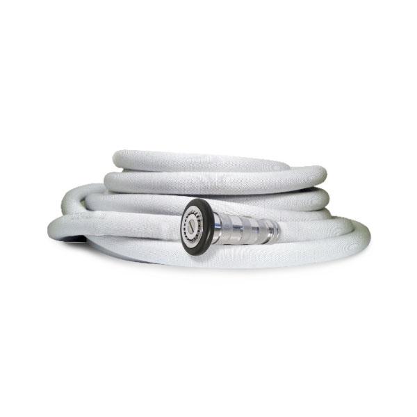Mangueira de incêndio construída com reforço têxtil em fio de poliéster de alta tenacidade (no formato espiral) e internamente por um composto de borracha sintética vulcanizada diretamente ao tecido.
